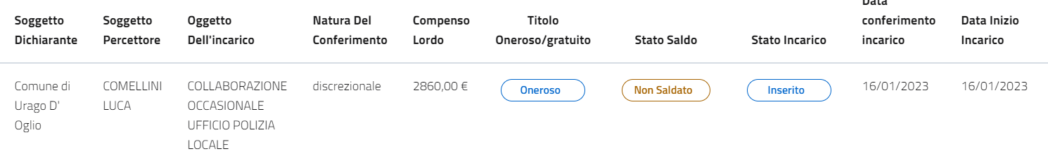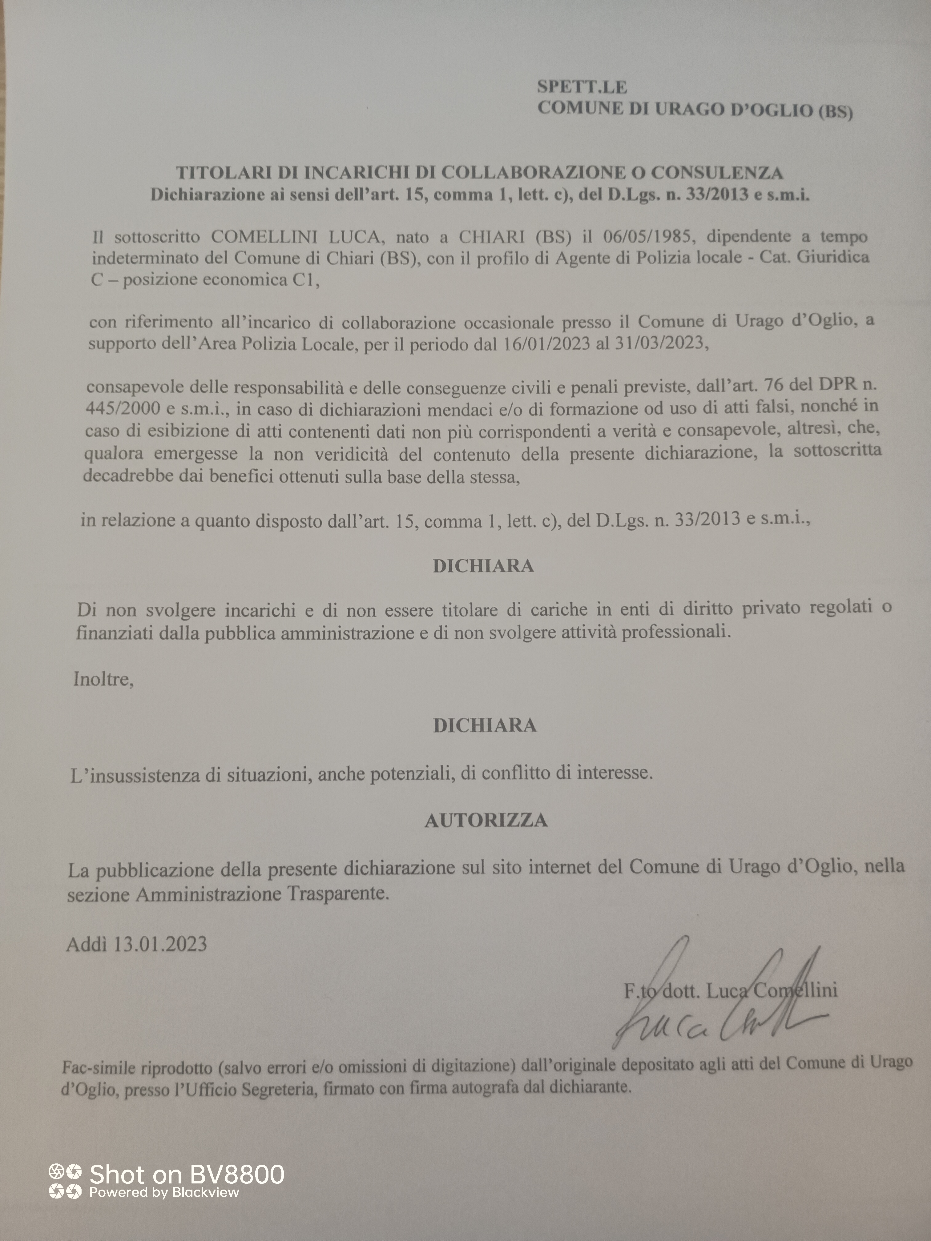 DOTT. LUCA COMELLINI - INCARICO DI COLLABORAZIONE ESTERNA PER SUPPORTO ALL'UFFICIO POLIZIA LOCALE - PERIODO DAL 16/01/2023 AL 31/03/2023 - COMPENSO € 2.860,00.